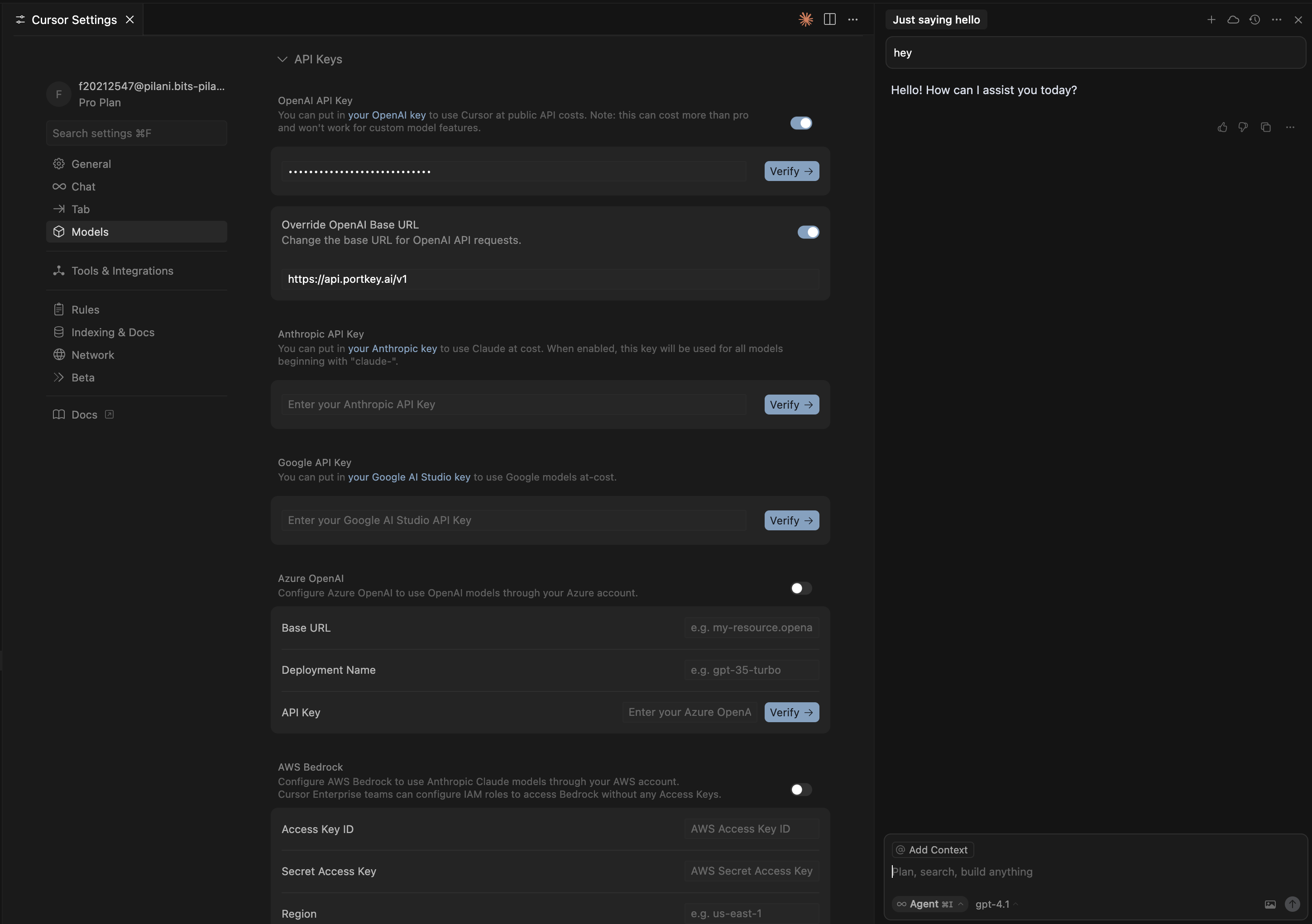 When using Portkey, Cursor-specific features (autocomplete, Apply from Chat, inline refactoring) require Cursor Pro/Enterprise plans.
